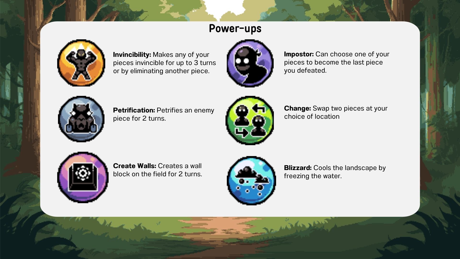 Save the forest in this improved version of chess with new boards with obstacles and power-ups.