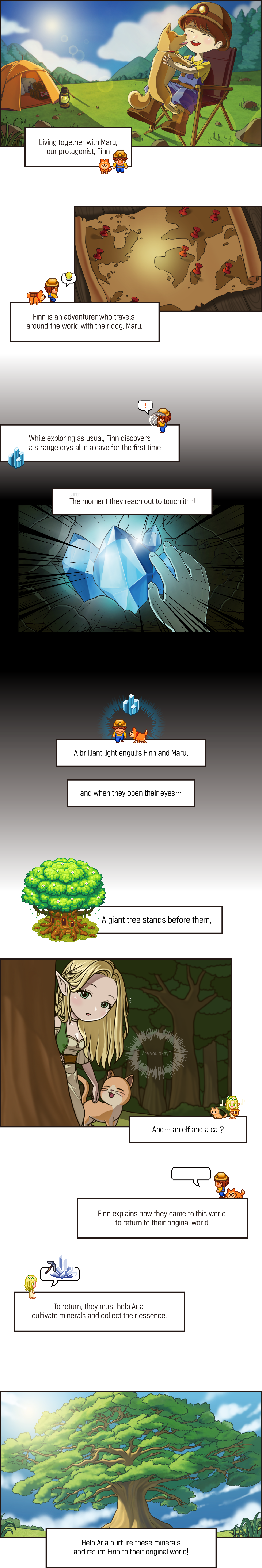 Curious Ffin and Maru are drawn into a magical fantasy world by a mysterious force! 🌀 There, the legendary World Tree stands tall, and your touch will gradually bring this mystical land back to life. 🌳 With the help of your adorable companion, Aria, explore and nurture this enchanting world!