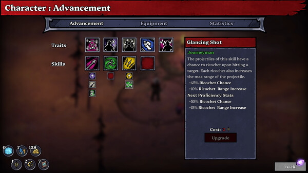 As you gain experience and level up during a run you will earn points to choose from a random selection of new character Traits, Skills, and Skill Modifications and enhance your strength. The myriad of possible combinations of these enhancements allow each run to feel fresh.