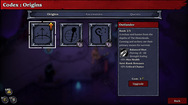 Each run will start by choosing a character Origin. This Origin will decide the starting weapon, skill, and stats of your character for the run. After completing two stages in the run you will select an Ascension for remainder of the run. The Ascension will increase and specialize your stats. Additionally, a powerful Ascension Aura will be created around your character. Origins and Ascensions can be permanently upgraded through the Codex at your hub.