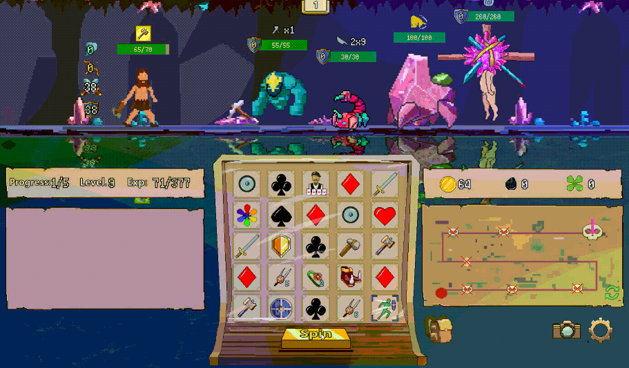 Click Spin to start the slot machine and randomly generate combinations of symbols. Combined with different relics, this will produce varying attack and defense outcomes.