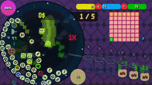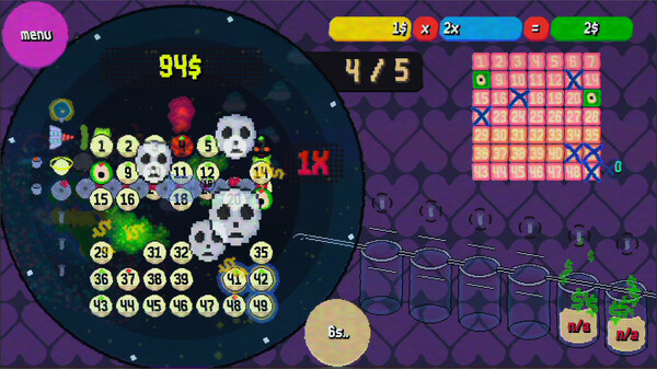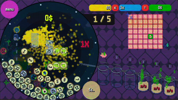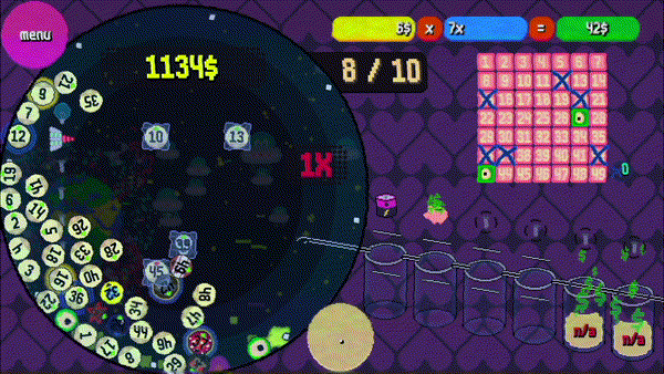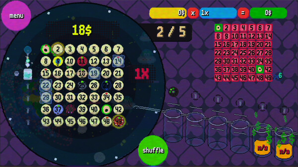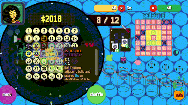 Choose a special ball each round and transfer its properties to one of the 49 standard balls. This way, you can manipulate things like the drawing probability or the point value. Some balls can even freeze or slime adjacent balls, preventing them from falling into the drum.