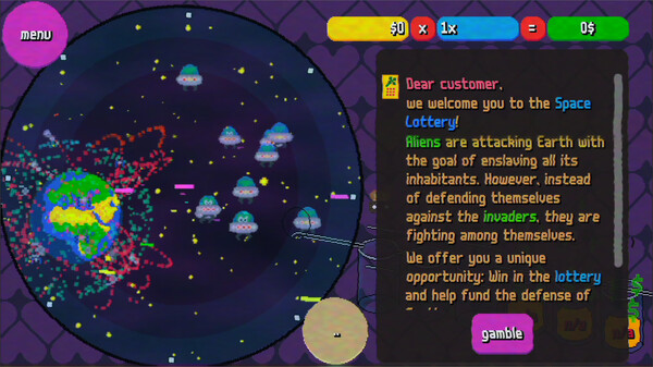 Lottery vs Aliens is a highscore deckbuilder about winning lottery money to pay for defense satellites against aggressive aliens. You can manipulate the machine and every ball to skyrocket the output. This game contains neither real-world money nor any microtransactions.