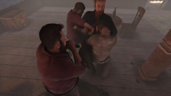 You can throw different punches and kicks or you can grapple your opponent in combat. You can also grab glass bottles and swing or throw them to your enemies. Characters have active physics and ragdoll system all the time so all the characters reacts to hits realistically, you can even hit the pianist or the bartender. Damage is depend on physics as well so timing your punches and positioning your character is very important. You can also block your opponent's attacks but if you can't position your character well a punch can hit you. Use the environment to your advantage is also important since there are lots of bottles chairs and table in the saloon.