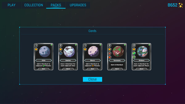 Unlock the cosmos with card packs! Purchase packs using Stardust earned in-game. Each pack contains cards categorized by rarity, temperature, surface or creatures. Open packs to discover new planets and expand your collection, adding depth and variety to your strategies.