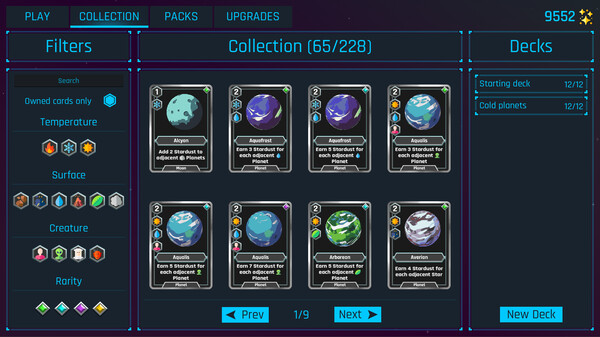 Browse and organize your unlocked cards in your collection. Use filters to sort by rarity, temperature, surface or creature. Alsco do search for specific cards. Create custom decks by adding cards from your collection and preparing strategies for your next galaxy-building game.