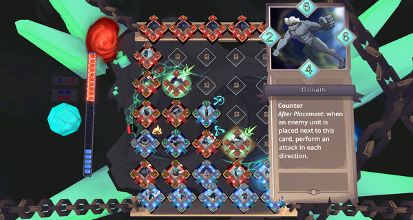 Wherever a unit is placed, it attacks neighboring enemies, with different combat values in each direction; a higher value than the opponent means that control of the enemy unit, its abilities, and its board-space is flipped. Different units have different chaining capabilities, sometimes causing the effects of one placement to ripple all the way from one end of the board to the other– and the most powerful units have devastating special abilities that define their armies and change the flow of play.