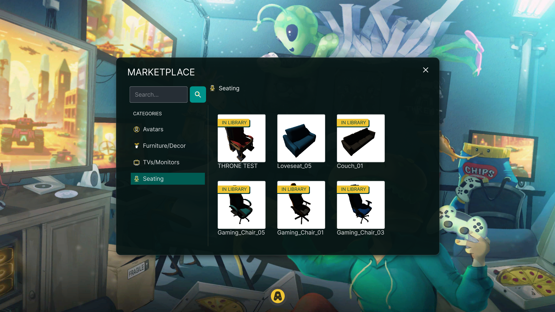 Our in-app marketplace allows our community to share its creations. Easily download avatars, furniture, decor, and other items to design your perfect space, or upload your creations to share with others.