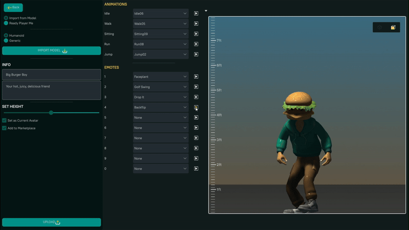 Express yourself exactly as you want with full control over your avatar. Find the perfect avatar on our marketplace or easily upload your own design. We give you the freedom to fully customize all aspects of your avatar including its scale, animations, and emotes.