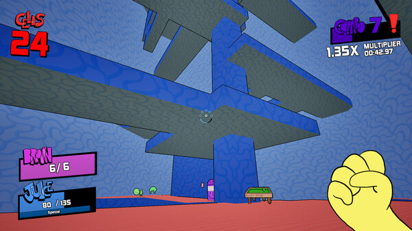 Attacking drains your JUICE meter, but defeating enemies gets some back! There's also a combo system, which rewards skillful play with more Juice to use so that you can pull off impressive skips! But be careful, playing too recklessly will leave you open to attack!
