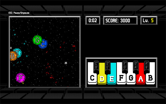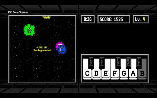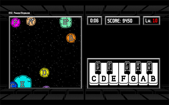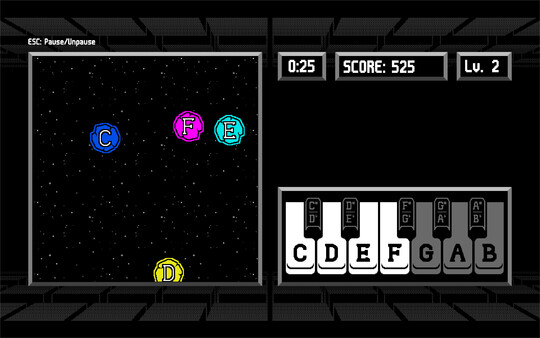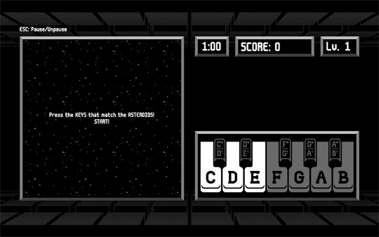 IMPORTANT NOTE: This game requires a MIDI keyboard device to be played. User interface elements are interacted with using mouse and keyboard, while the game itself is controlled with a MIDI keyboard. Make sure you have access to a MIDI keyboard and can connect it to your computer before playing. Also ensure that no other programs are running simultaneously that use a MIDI keyboard, as that can interfere with the game's functionality.