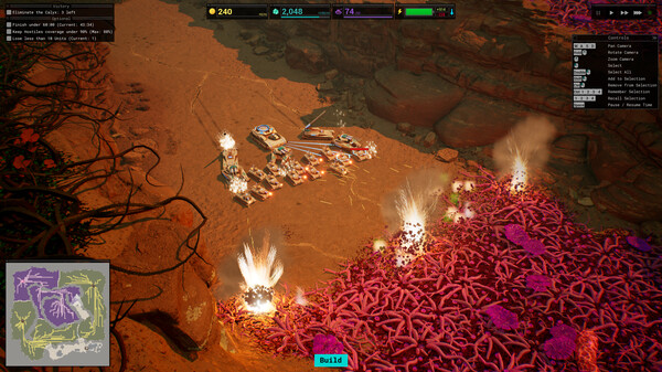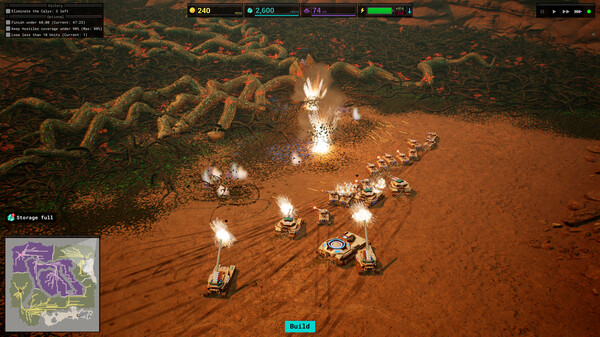 Build a power network, and set up Ore mines to gain Credits. Deploy a mix of defences and mobile units to stabilise the area and advance on the Calyx. Build walls and turrets to protect your base. Manufacture Scouts and Tanks to begin reconnaissance and provide additional cover as the Calyx gets stronger. Balance your base’s energy requirements carefully to avoid vital defences being down on power. Unlock new technologies to improve mining yields, increase power output, and build more powerful units.