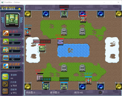 The game has The game is a multiplayer online 2D tank shooting game. There are two sides in total: the blue side and the red side, each side can have 1-4 people participate, and the number of people from both sides must be equal, so at most 8 people can participate. After the game starts, two teams will form a group battle. The one who eliminates all opponents first will win the final victory. The game map includes various terrains such as grasslands, swamps, snow, lakes, etc., each of which will have different impacts on the tank's movement; The game has normal bullet and two types of special bullets: super bullet and flash bullet. Being hit by super bullet will result in 200% attack damage and some armor piercing damage, while being hit by a flash bullet will have a certain dizziness effect; There are various props in the game, which can be obtained by hitting a special tank. There are props that can enhance various attributes of the tank, such as attack power, defense power, movement speed, attack speed, armor piercing ability, etc. There are also props for obtaining super bullet and flash bullet.