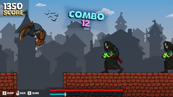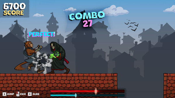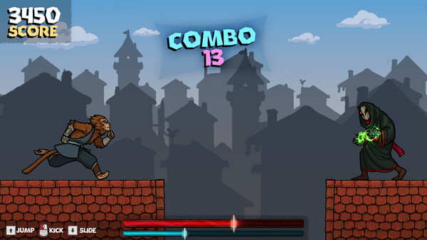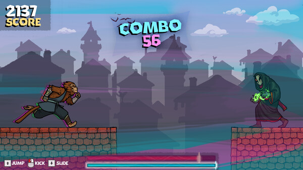 Jump, slide and kick to the rhythm of the music! In this side scrolling runner game you control a fantasy hero as they dash across the rooftops of a city swarming with cultists.