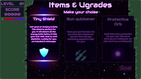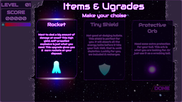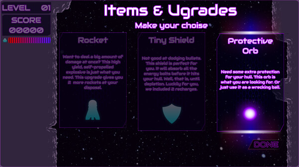 To bring you the old school 2D space arcade feeling in a modern look and feel. Whether you like the hard core style of the old days, or you have become the more lay back type, shoot your way home at the fun rate for you. Upgrade your ship on the way home, to get a taste of the full game. Have Fun!
