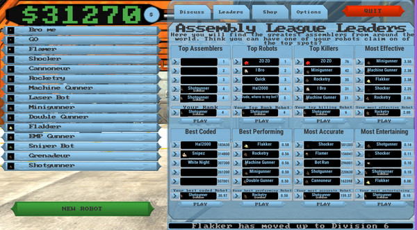 Choose from over 150 components to include in your killer robot. Design the ultimate robot combat strategy by writing real code. Upload your destructive creation to compete in the online league. Sit back and watch your killer robot wreak havoc in the battle arena.