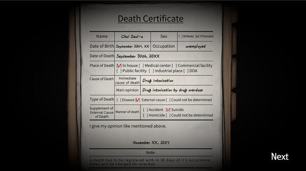 You have a death certificate from an unknown person in your hand. This person who ended her life by her will, died two days after her birthday. No one knows why you made act of doing suicide on a day full of happiness.