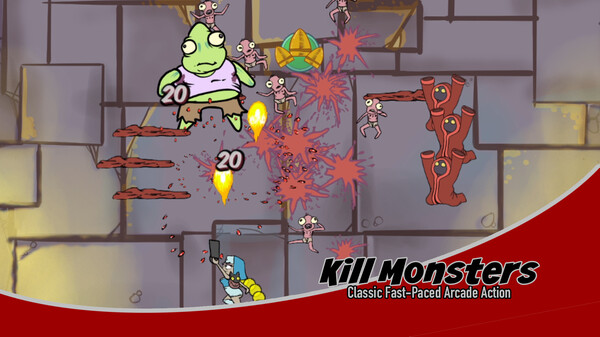 Run and Gun SHMUP action across arcade and story modes. Level up 6 distinct characters with unique special moves. Collect resources and build your base after battling multi-teared bosses.