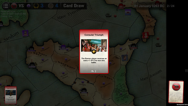 Hamilkar 264BC replays the First Punic War, a long land an naval war opposing the young Roman Republic to the Carthaginians, between 264 and 241 BC. The goal of the Roman Legions is to conquer the whole of Sicily, or capture Carthage.